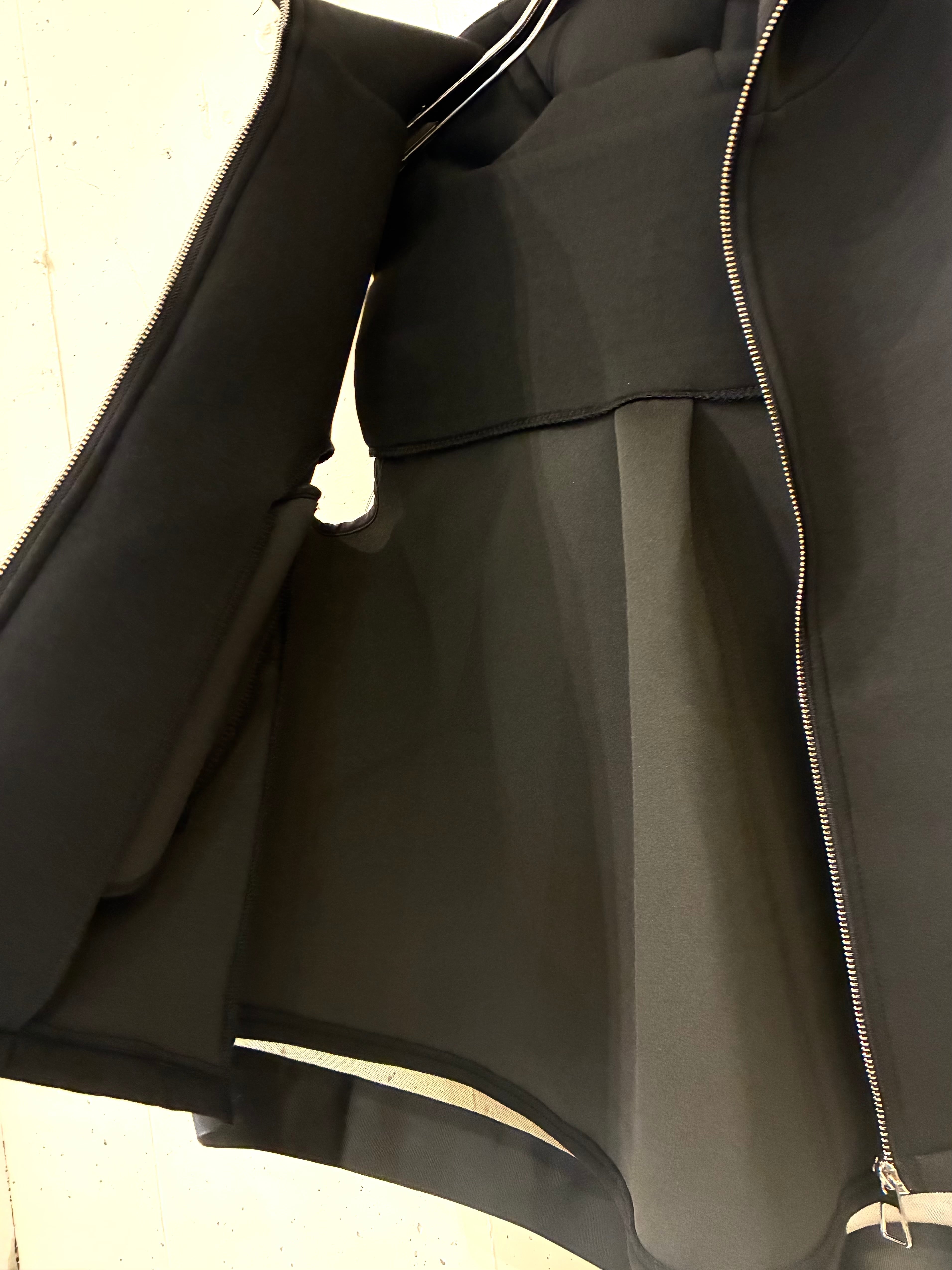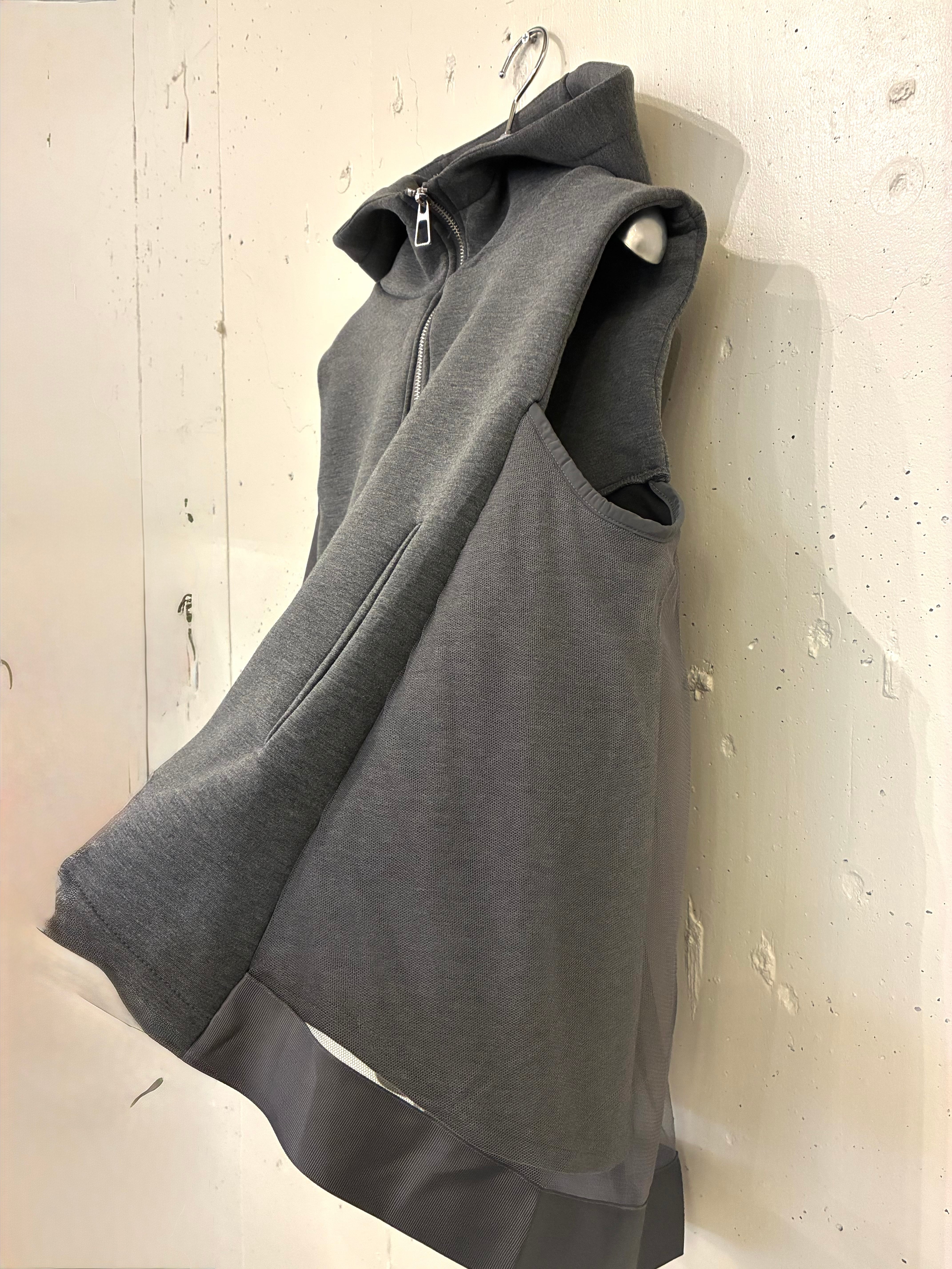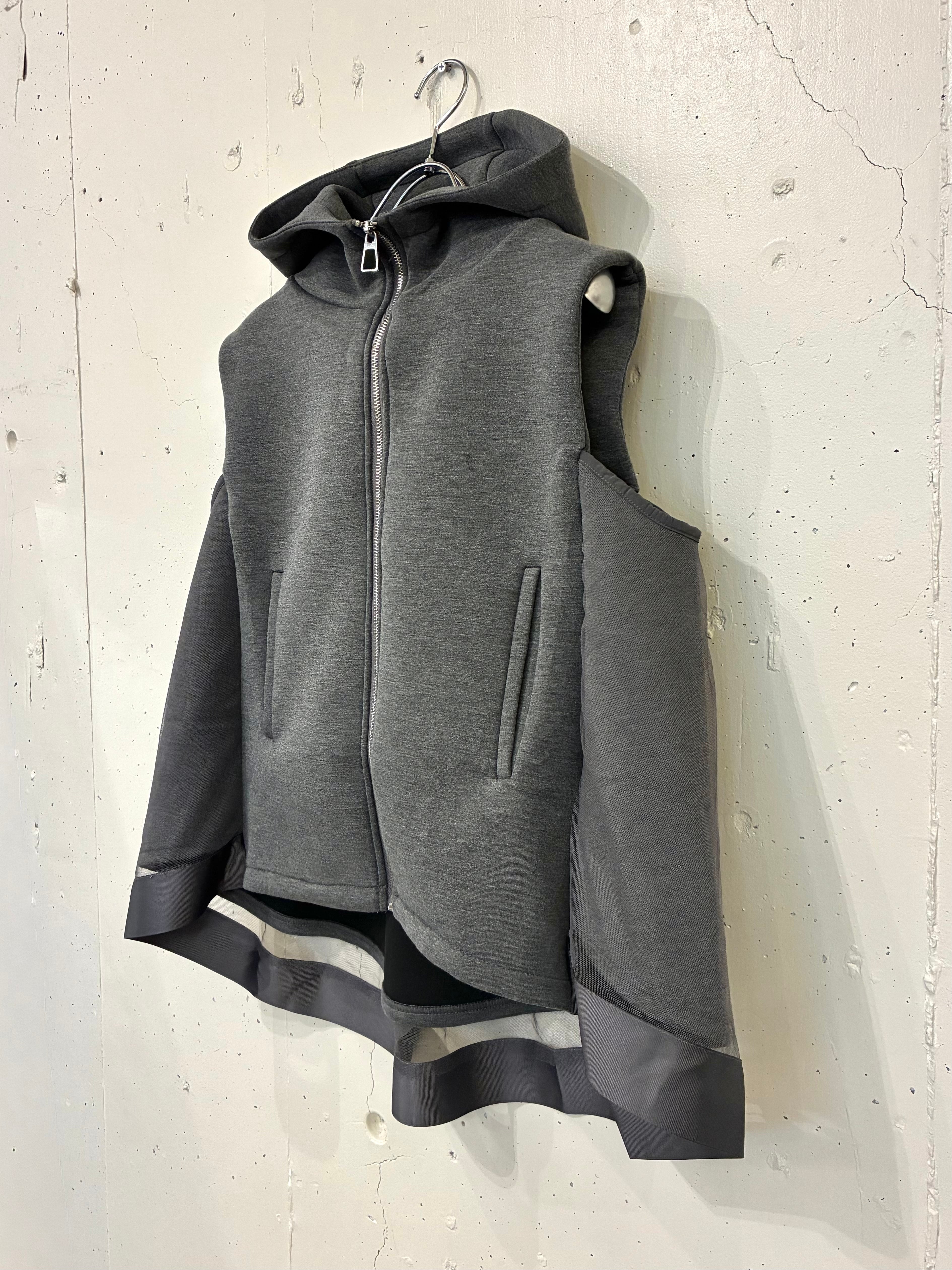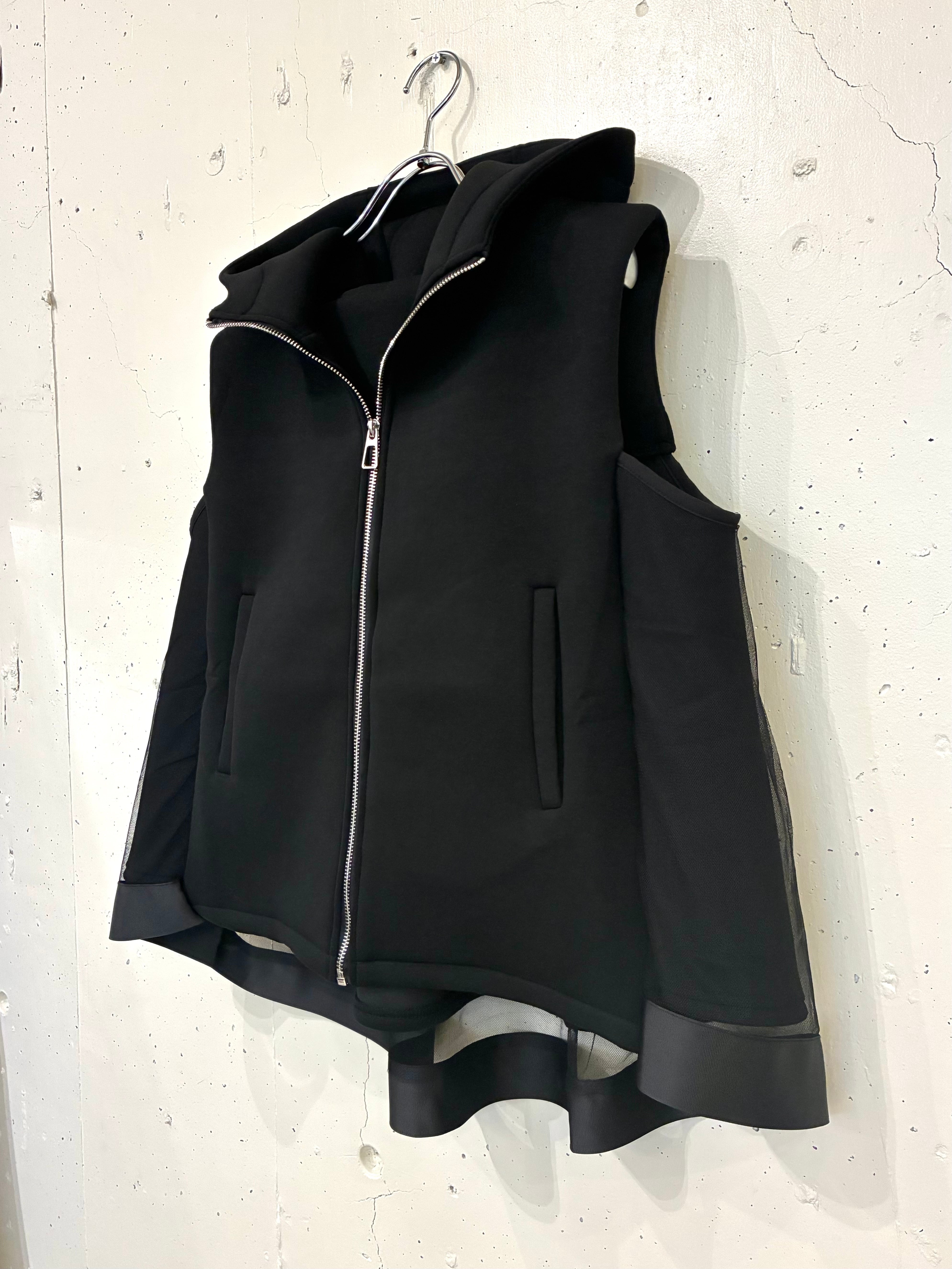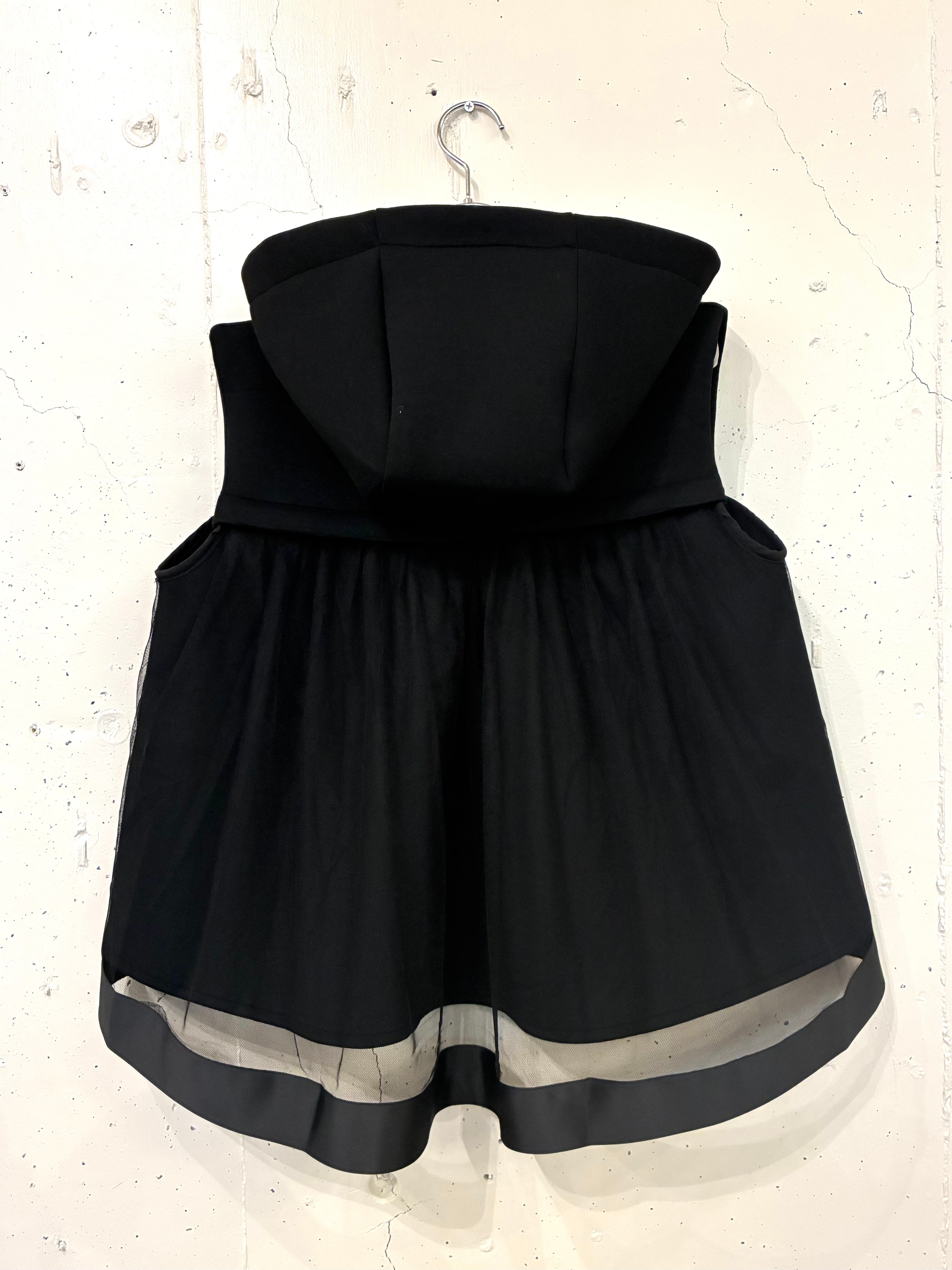 スポーティーなボンディング素材と、軽やかでモードなチュールの異素材ミックスが大人カジュアルを演出。