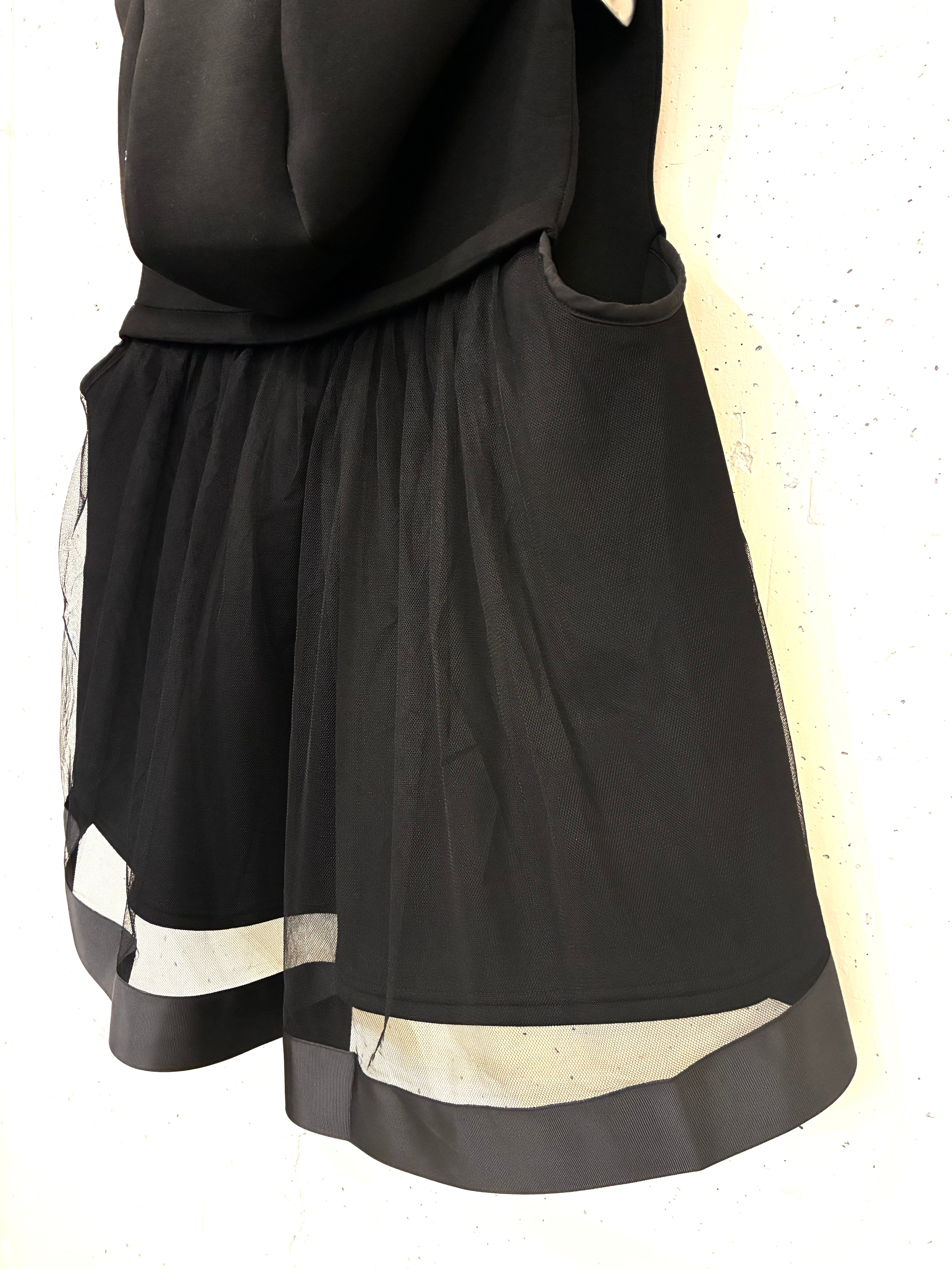 裾にはさりげなく透け感のあるチュール、動くたびに揺れるフェミニンさをプラスした一着。
