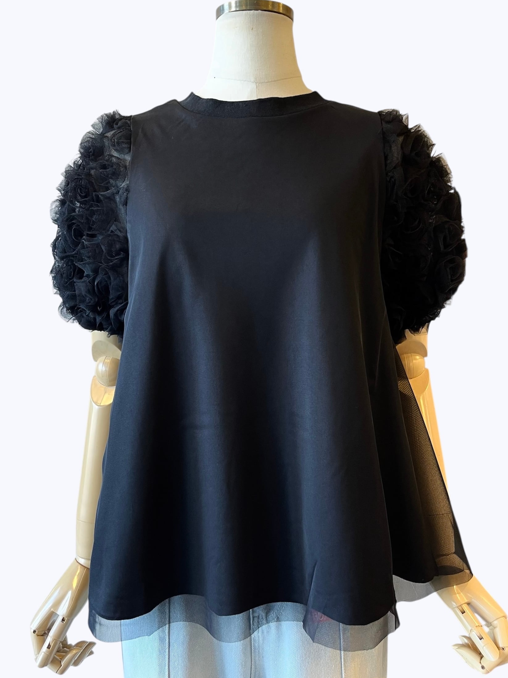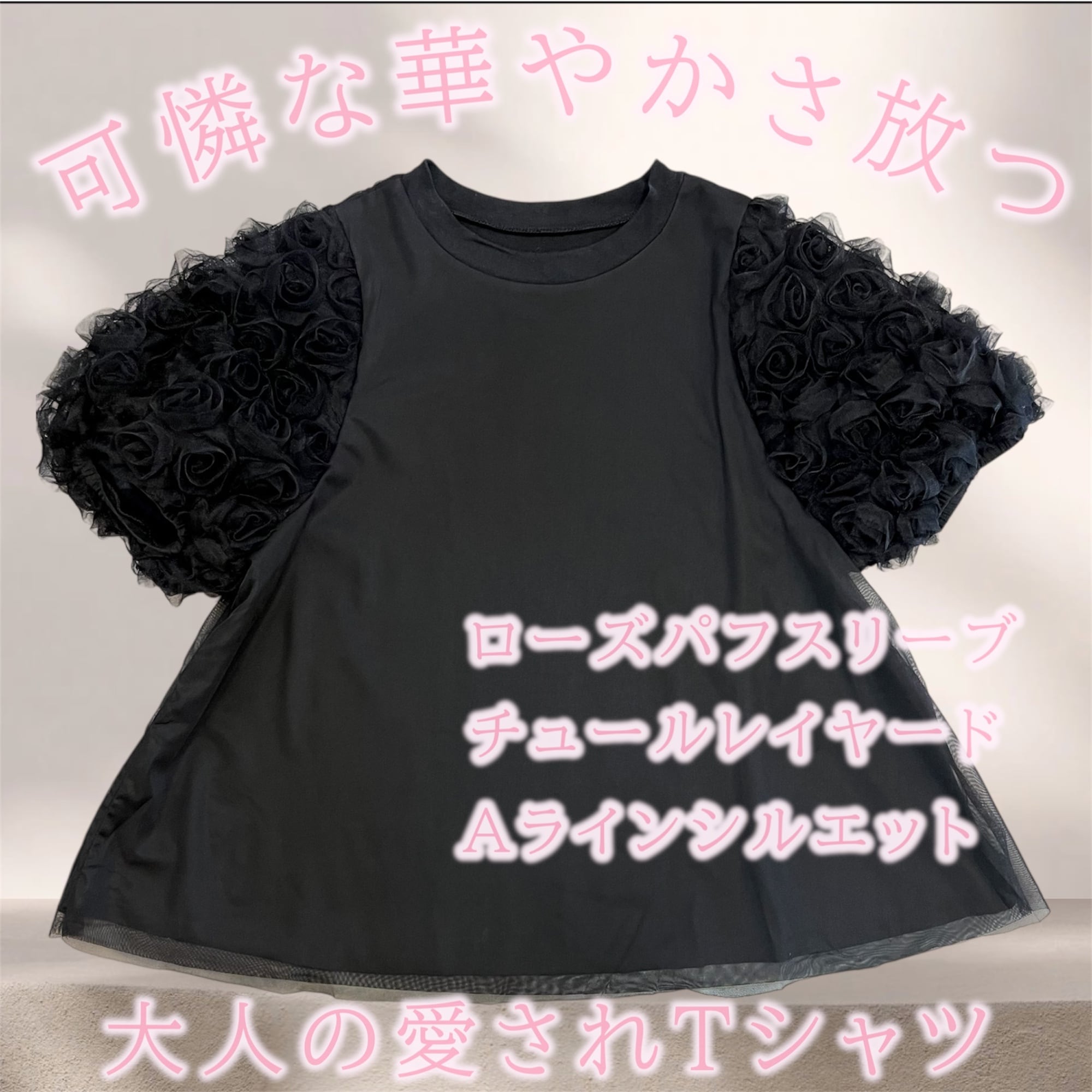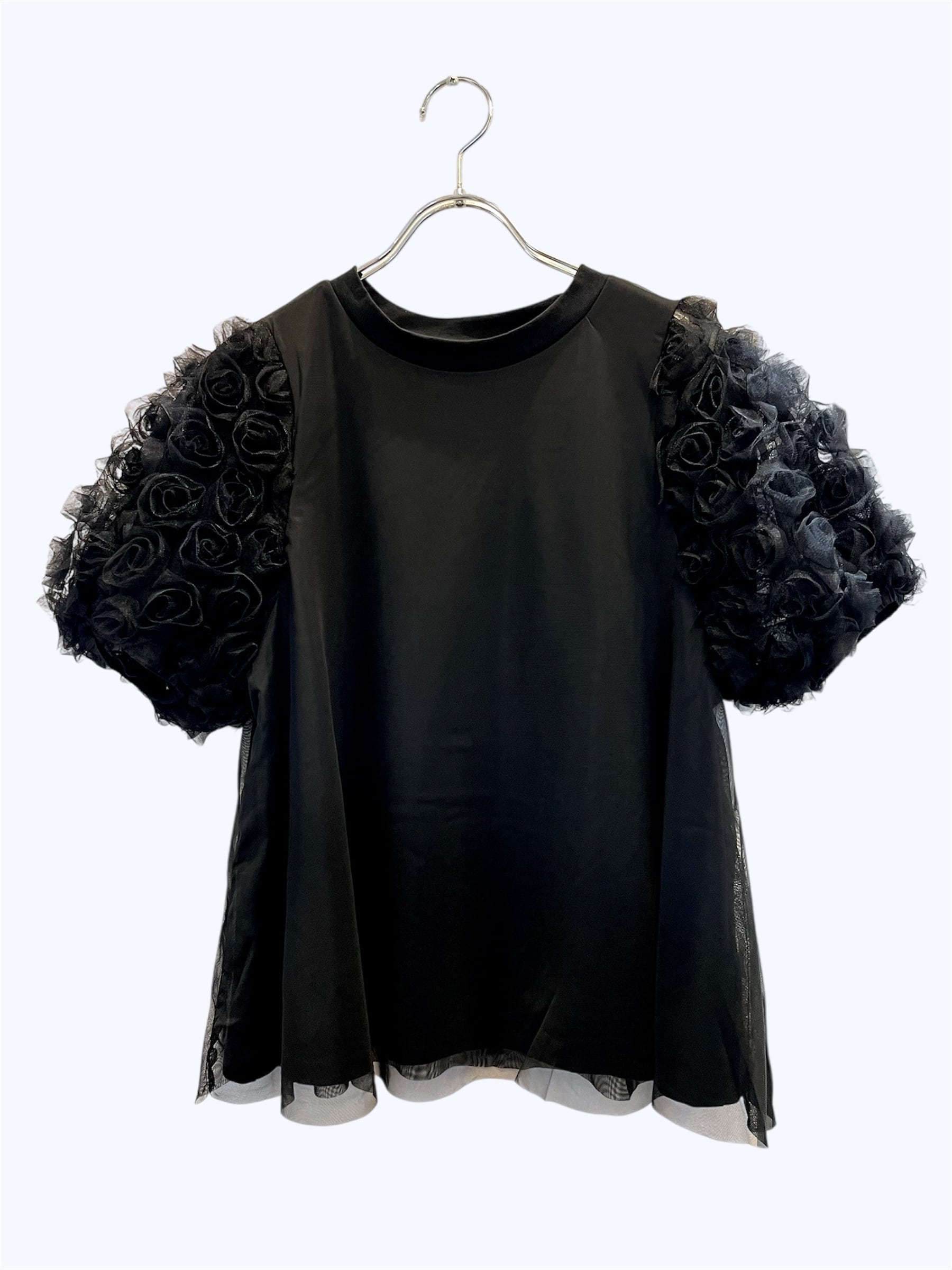 お袖にチュールで作られた立体感のあるローズがたくさん散りばめられた