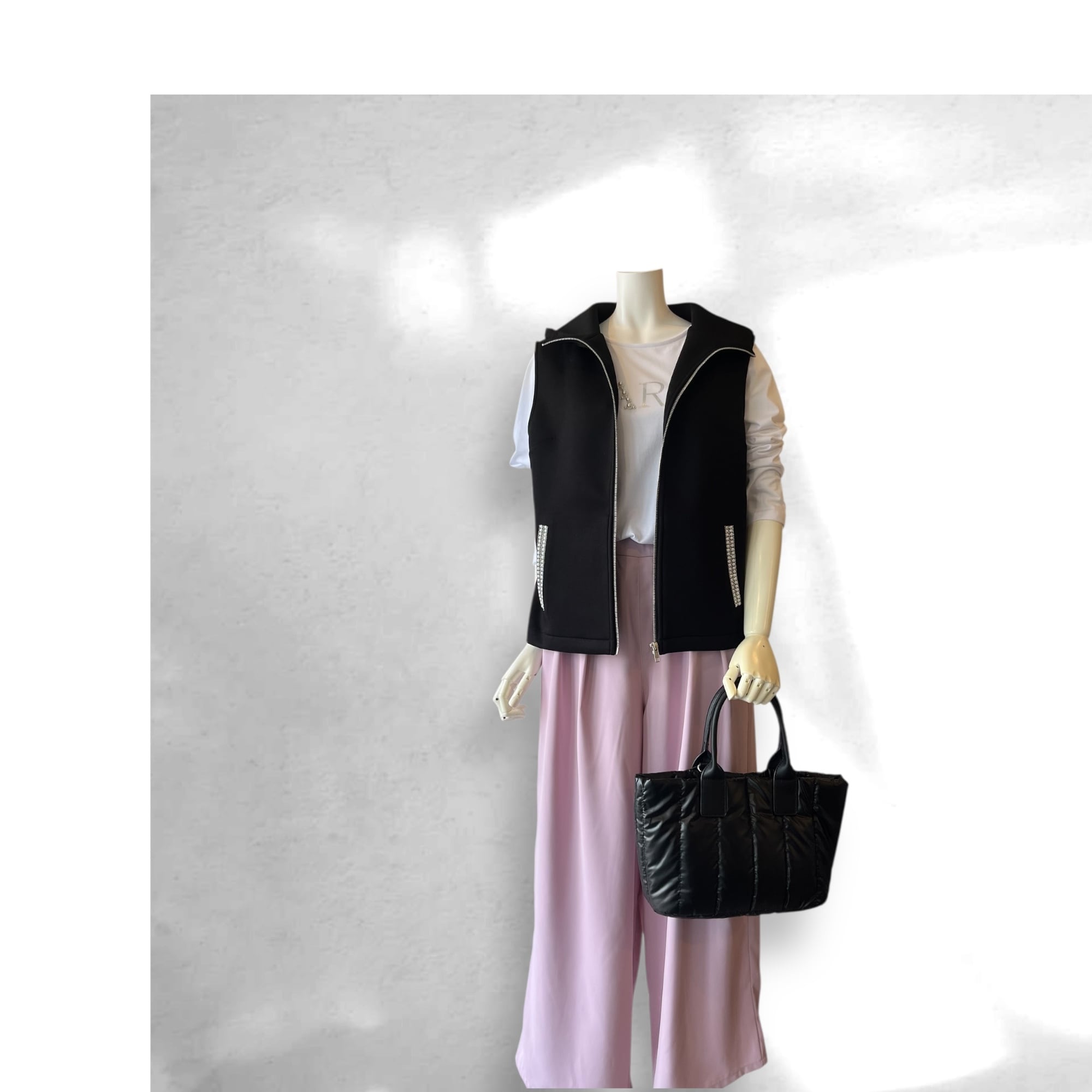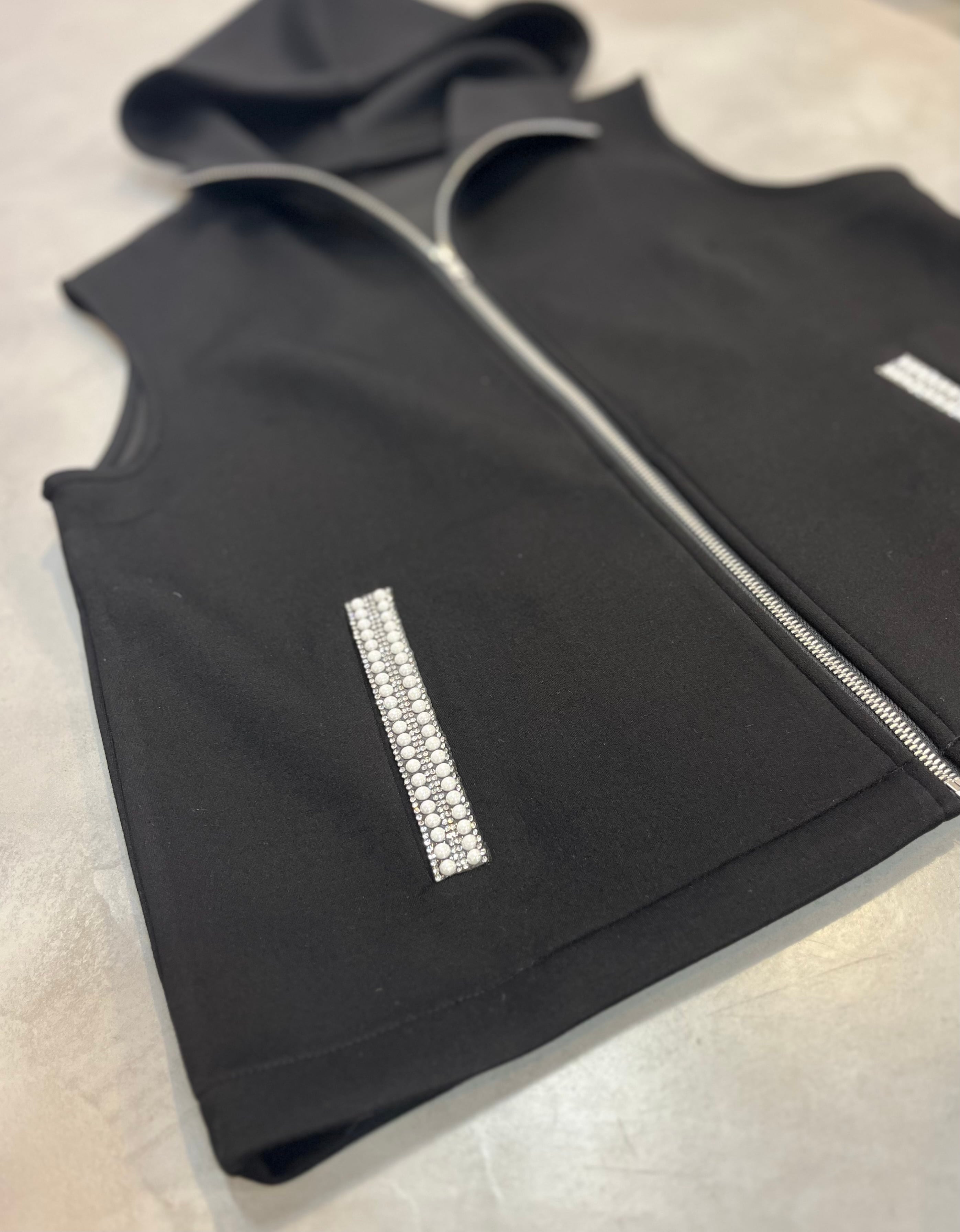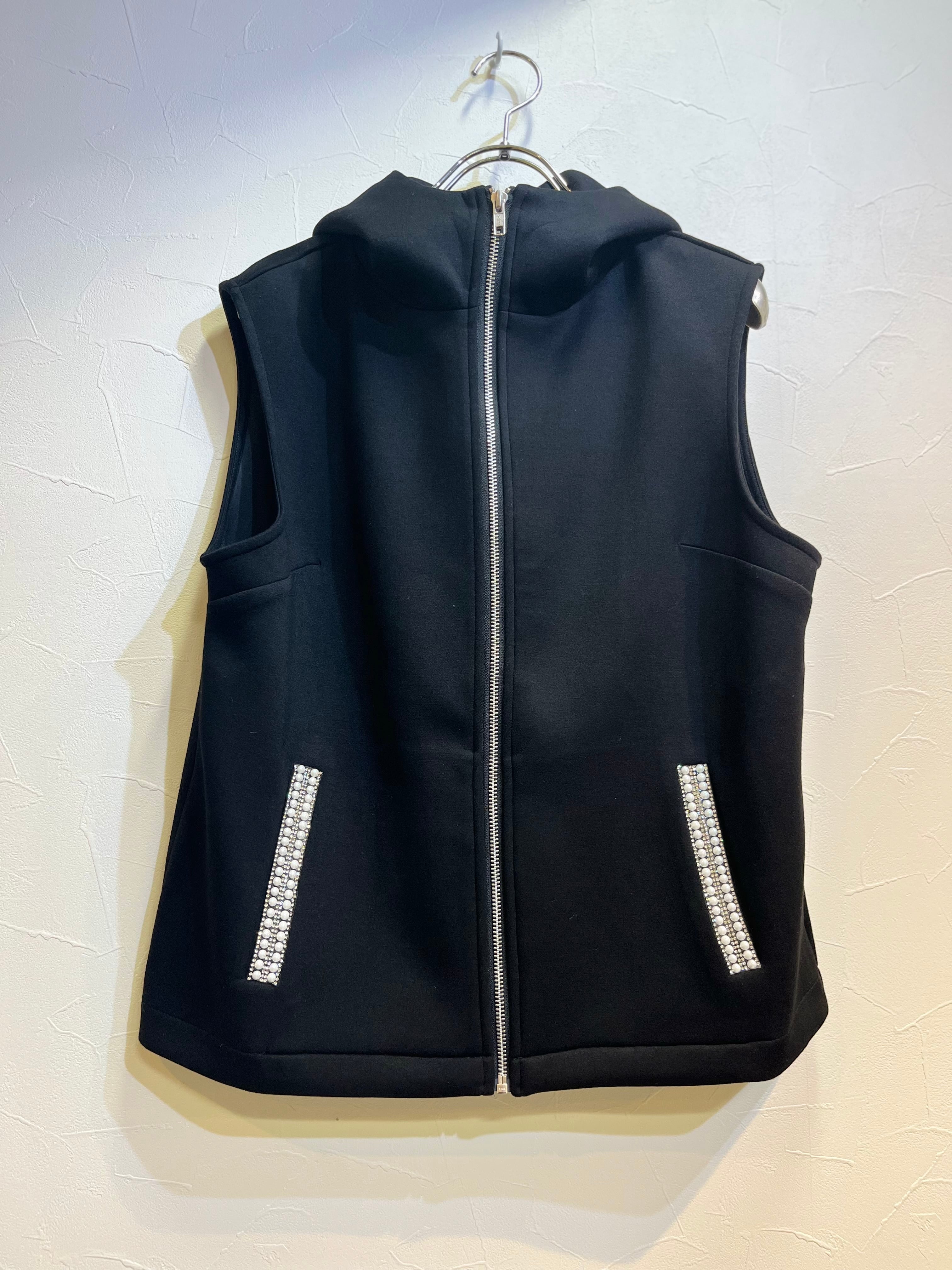 ポケット部分のラインストーンの輝きと女性らしいパールの華やかさが目を惹くベストです。