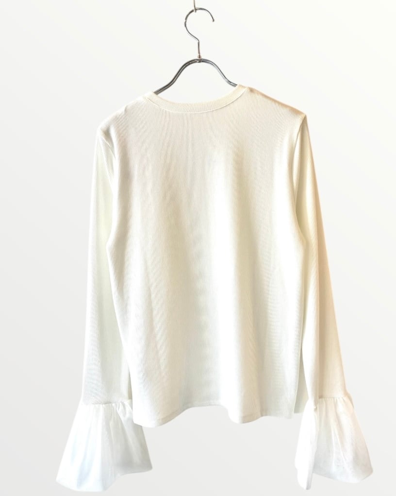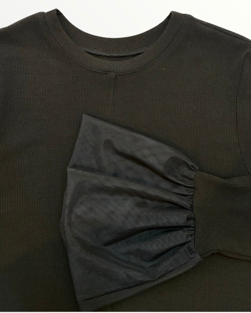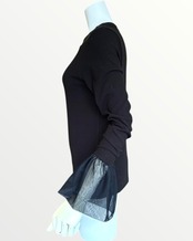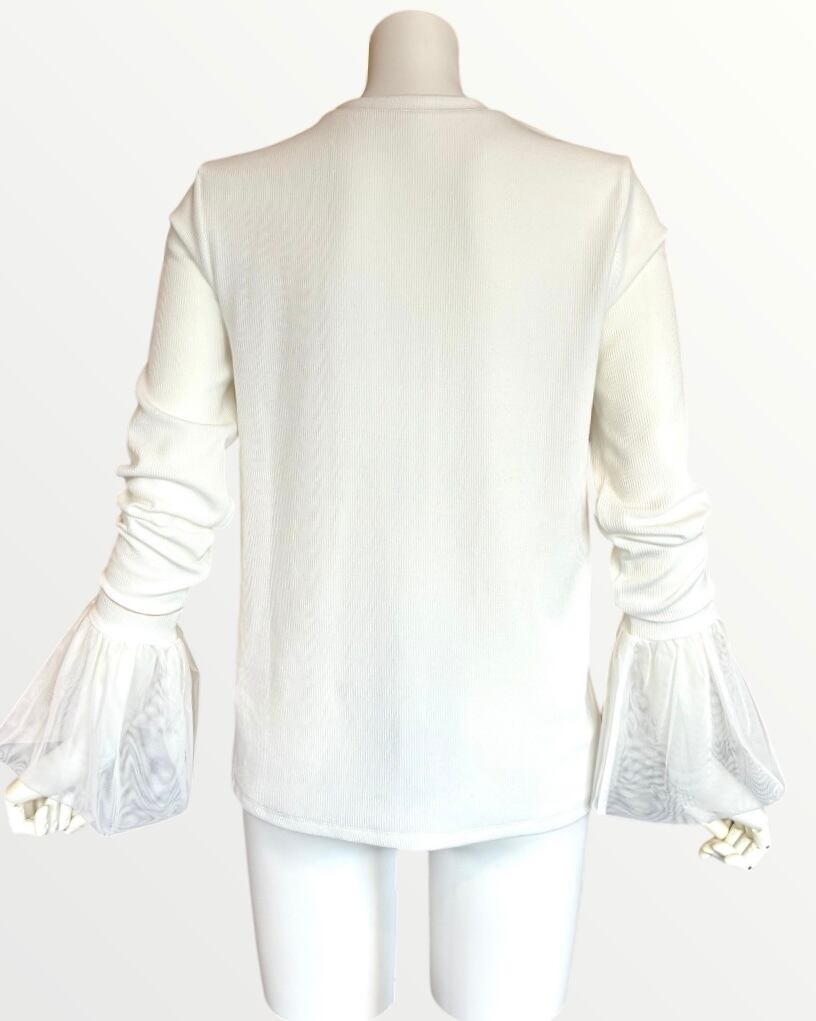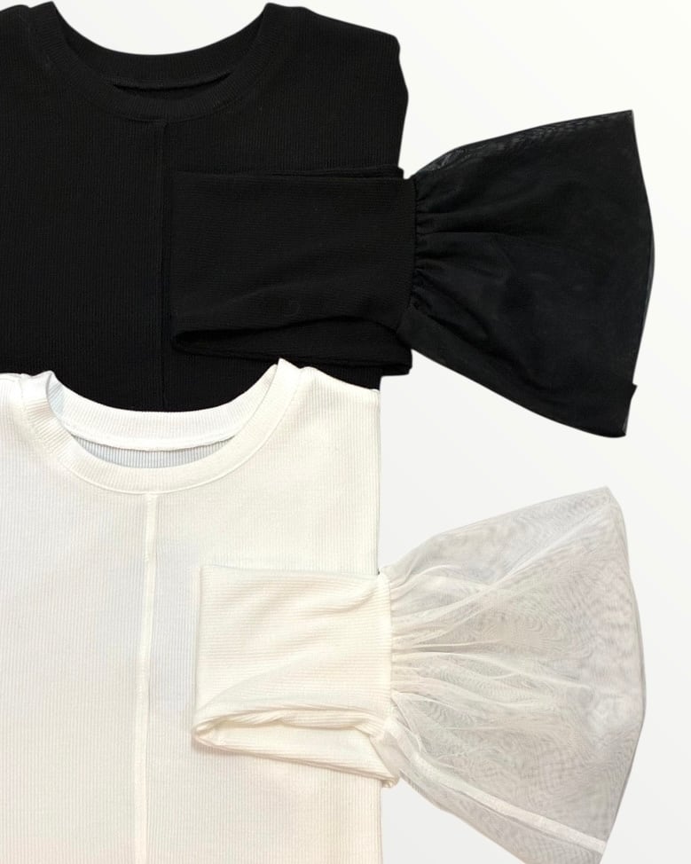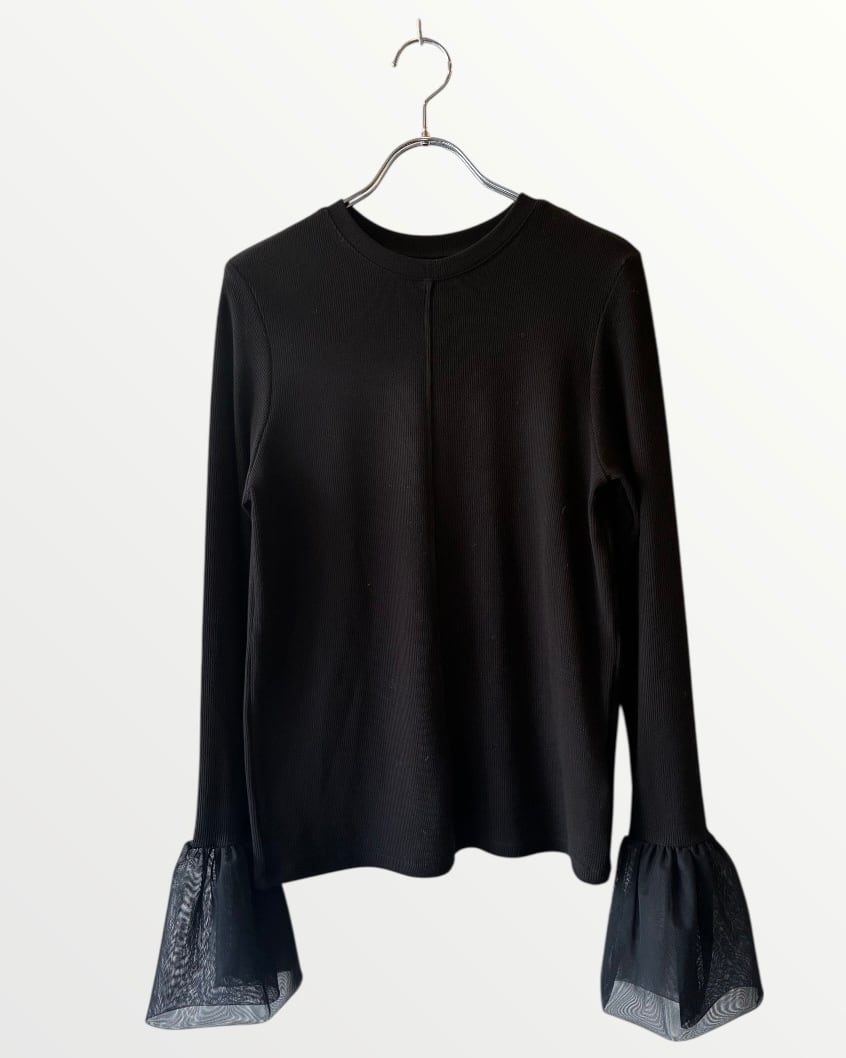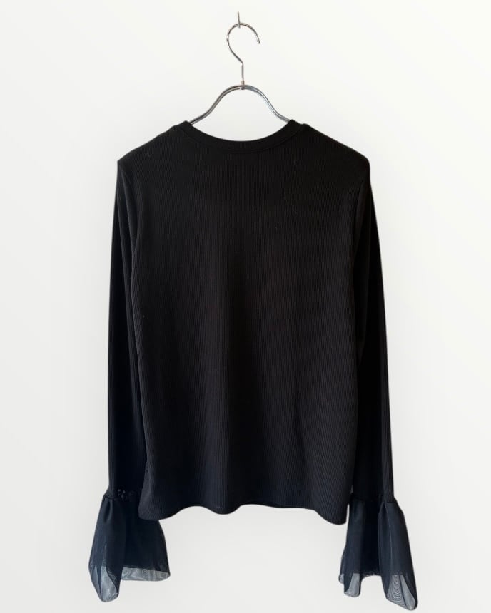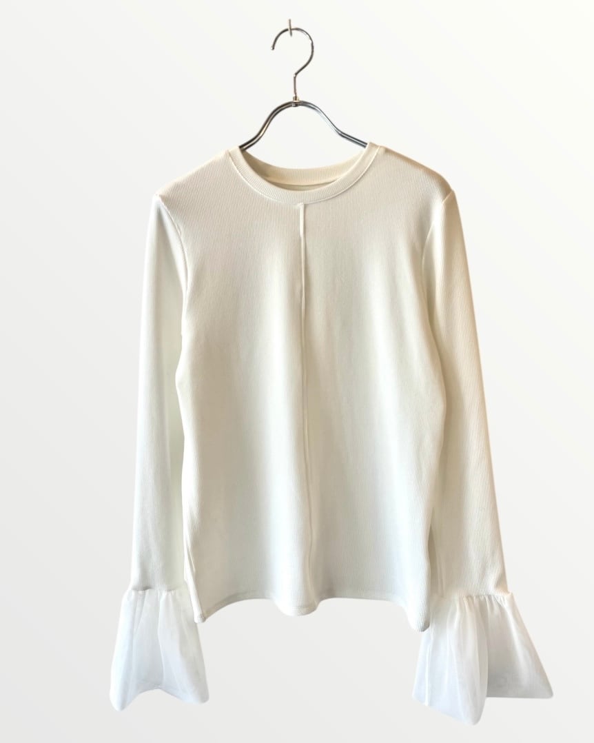 ふんわりとしたチュール袖が大人可愛いリブ編み長袖トップス。