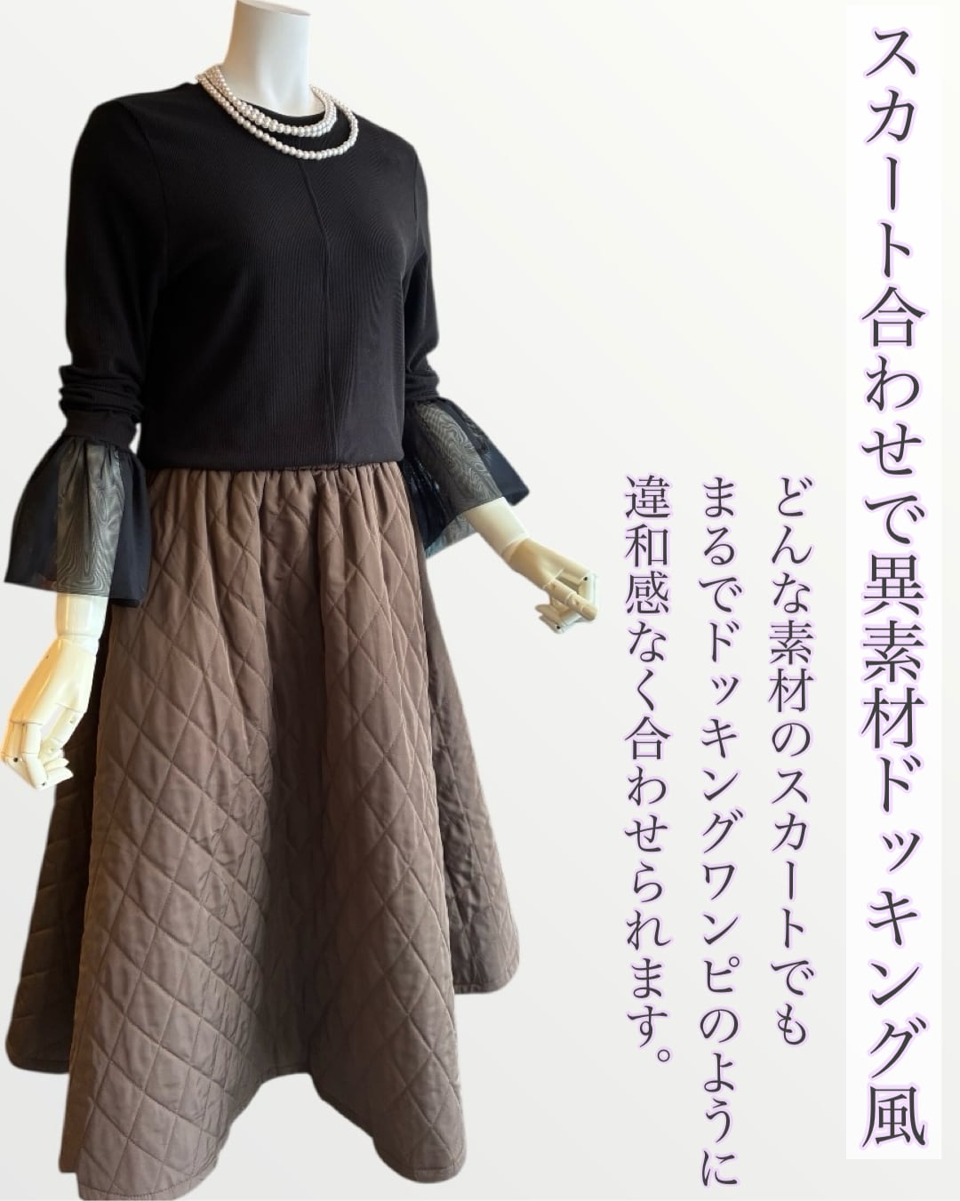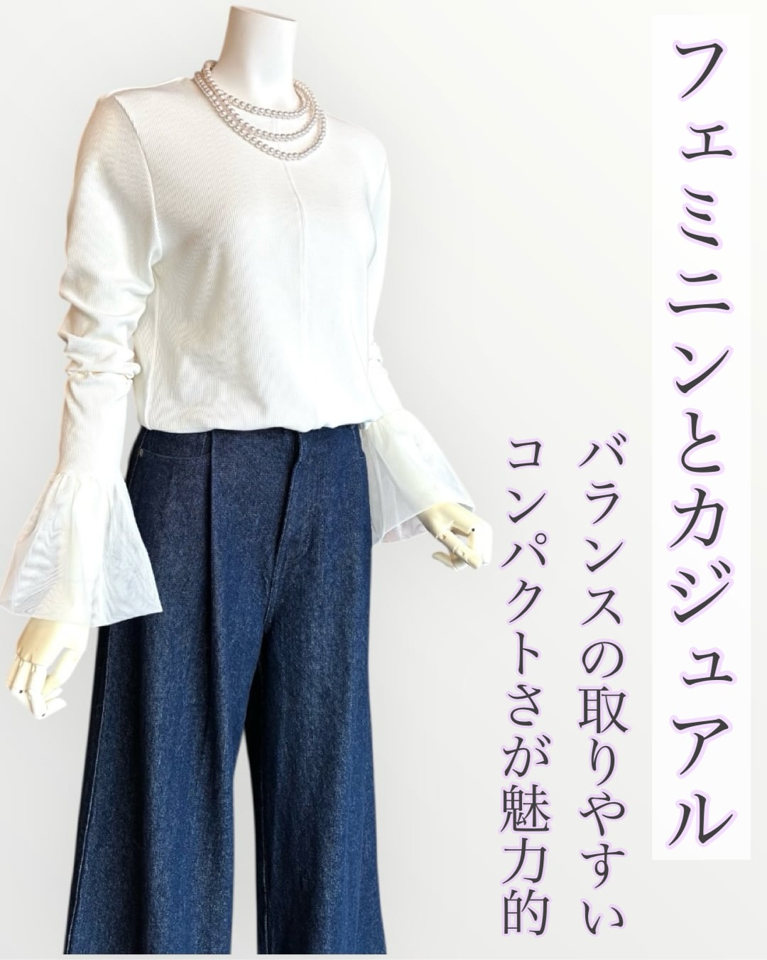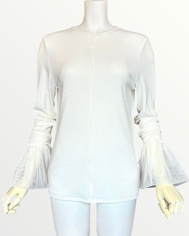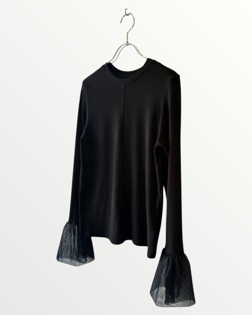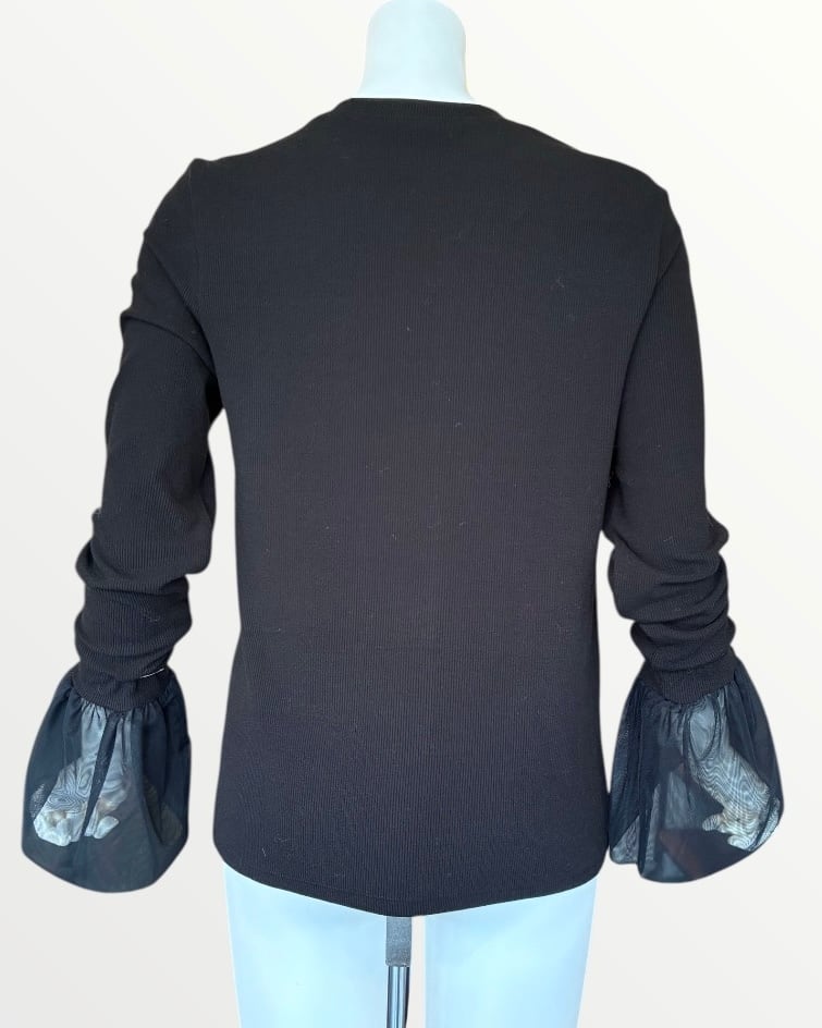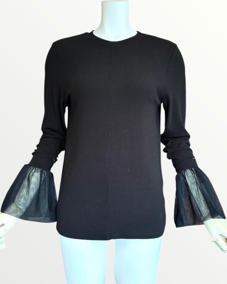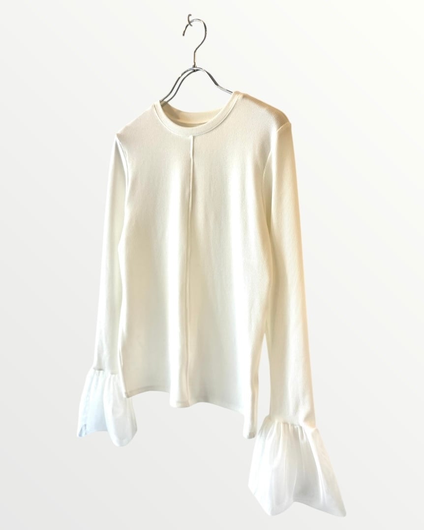 ふんわりとしたチュール袖が大人可愛いリブ編み長袖トップス。