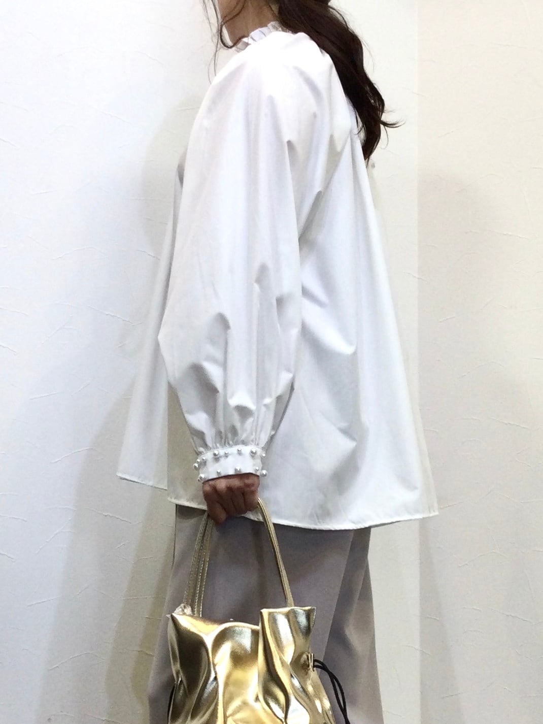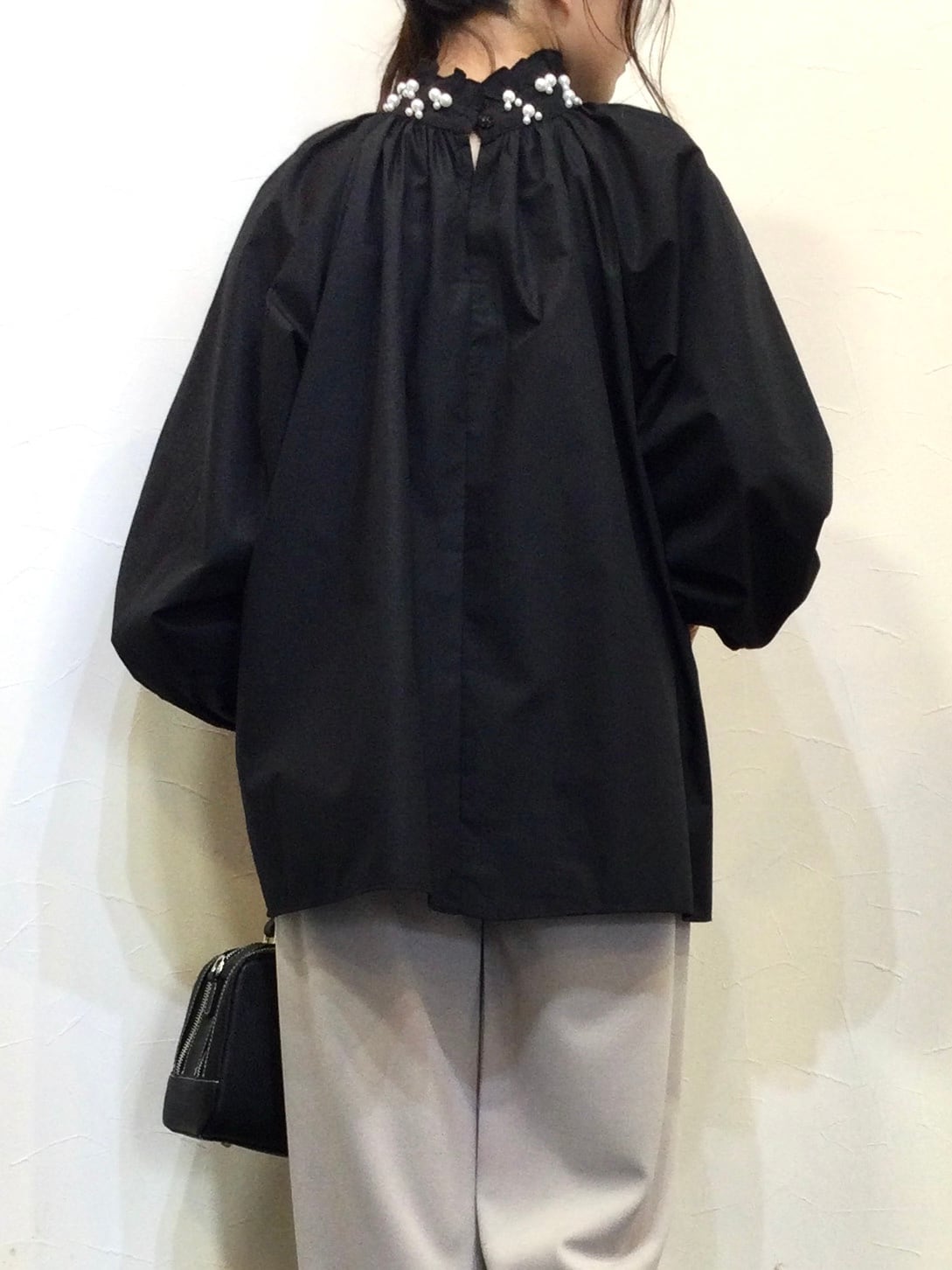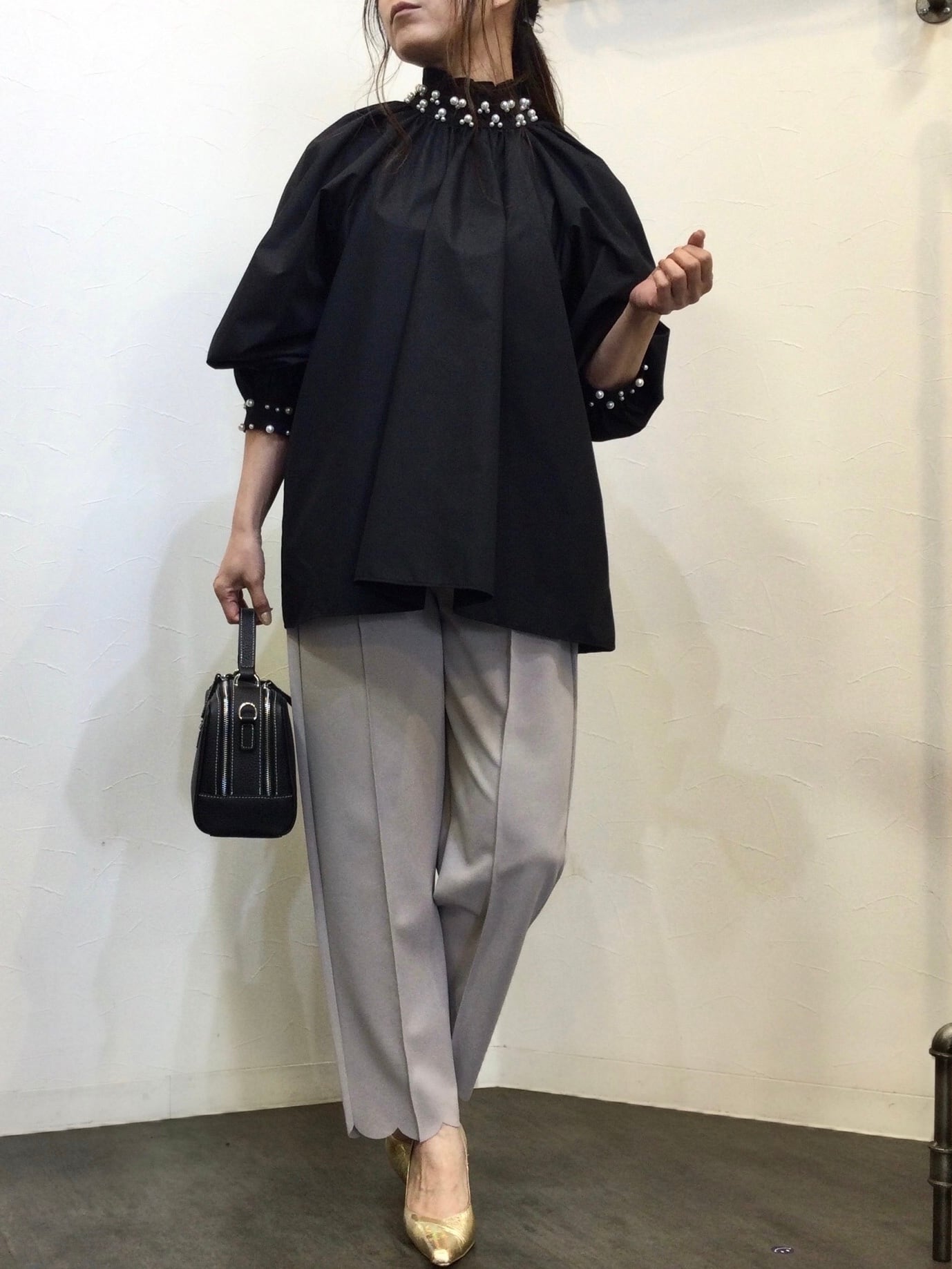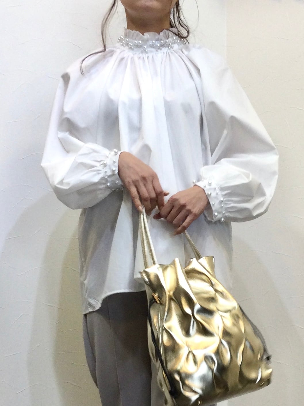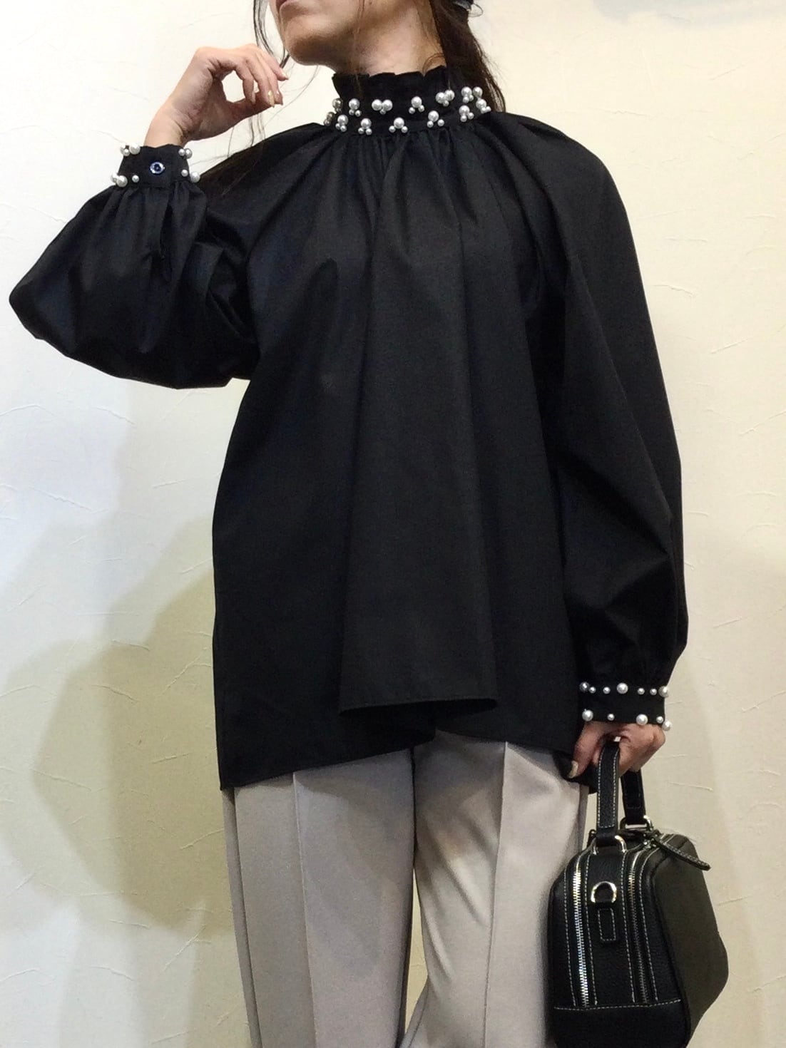 首元と袖口にあしらわれた繊細なパールが、顔まわりをぱっと明るく演出する華やぎブラウス。