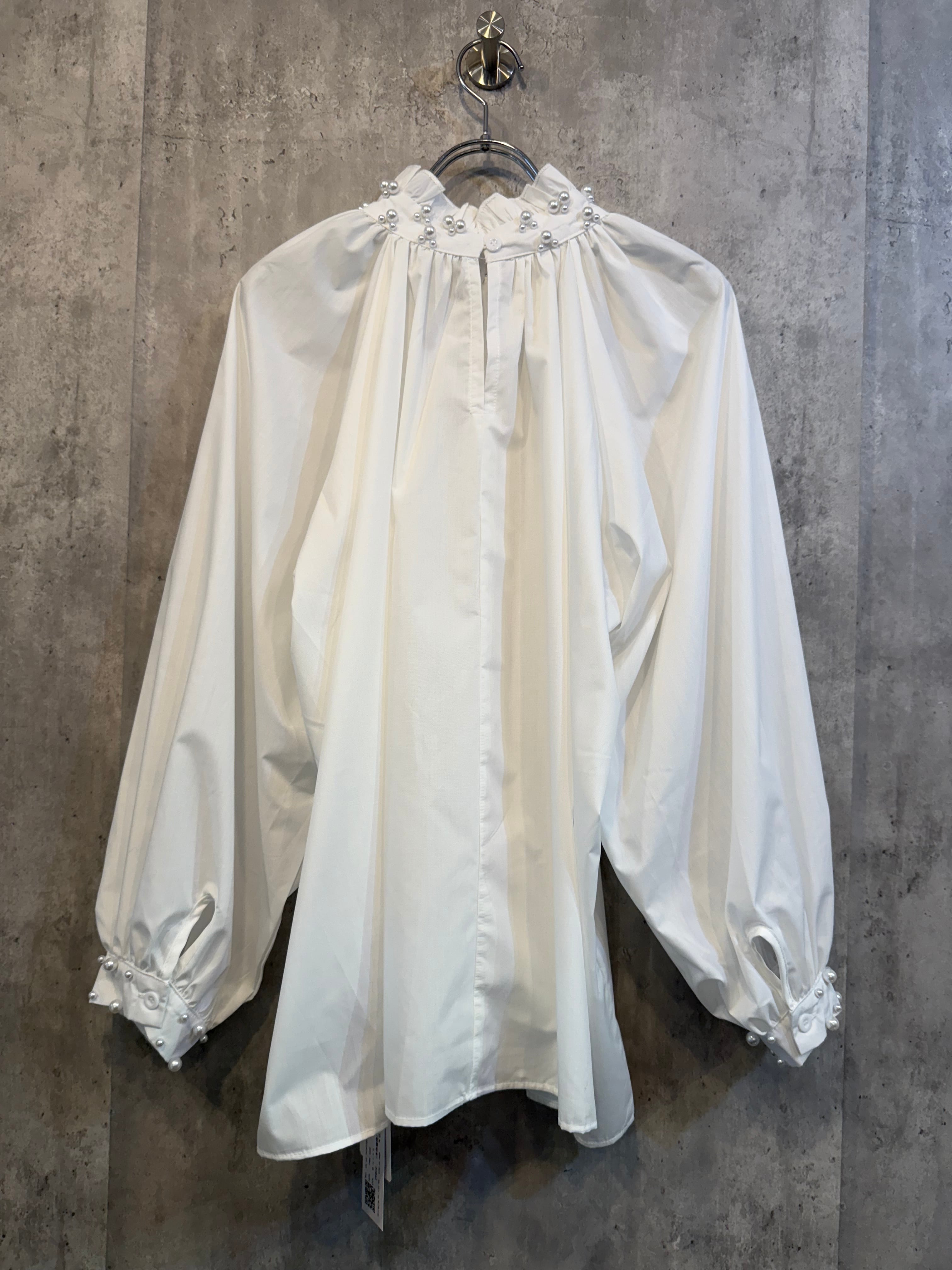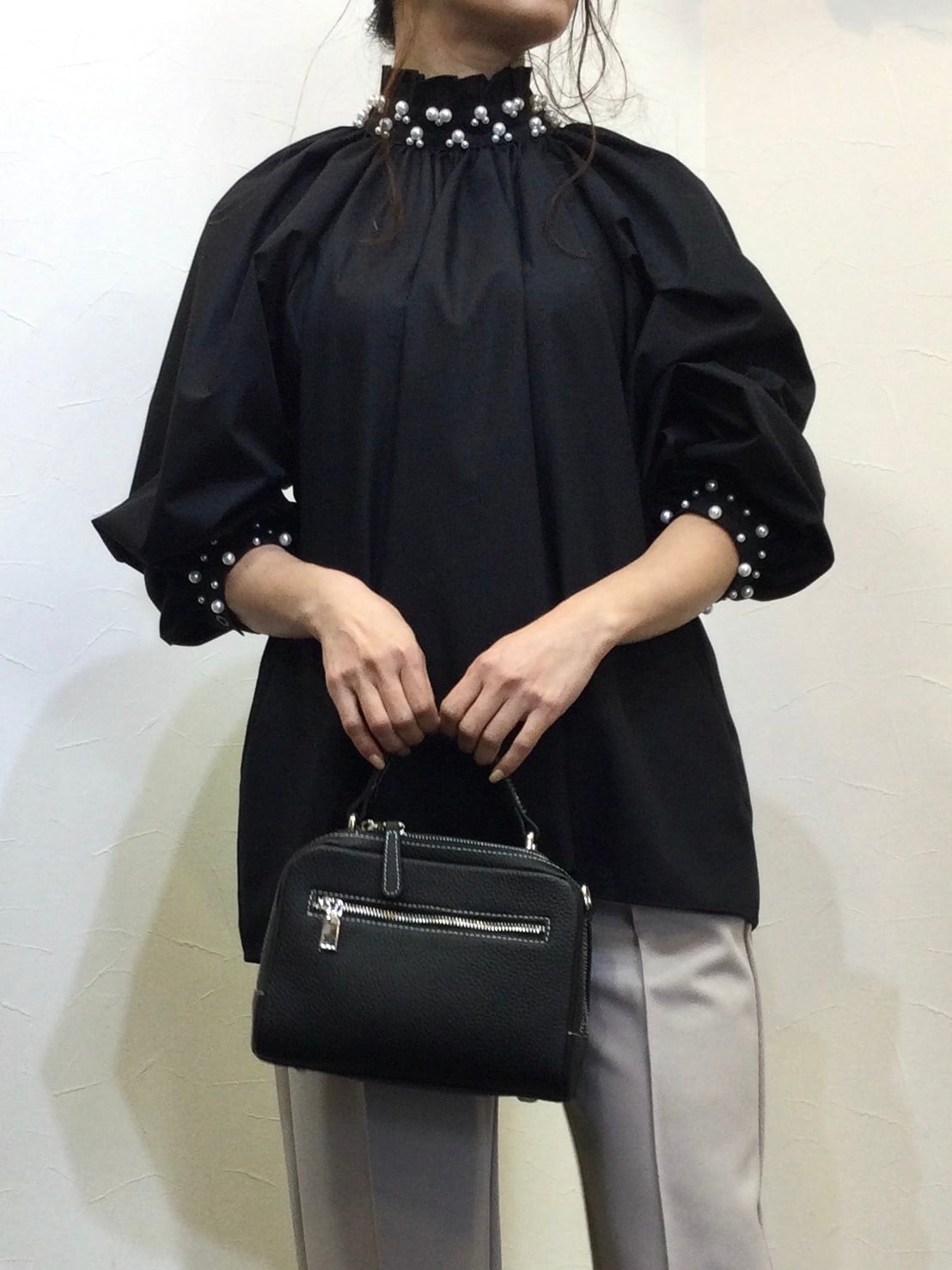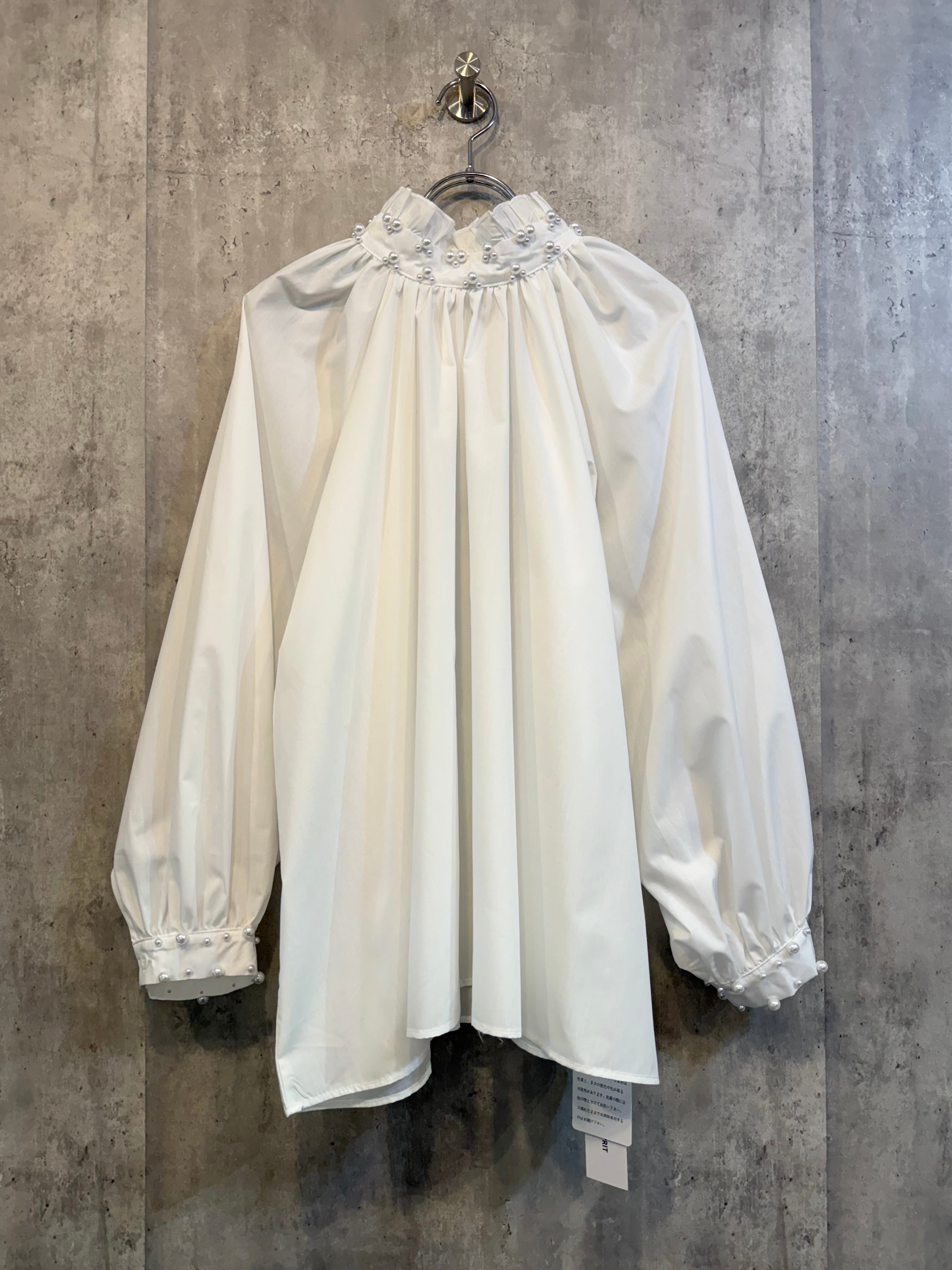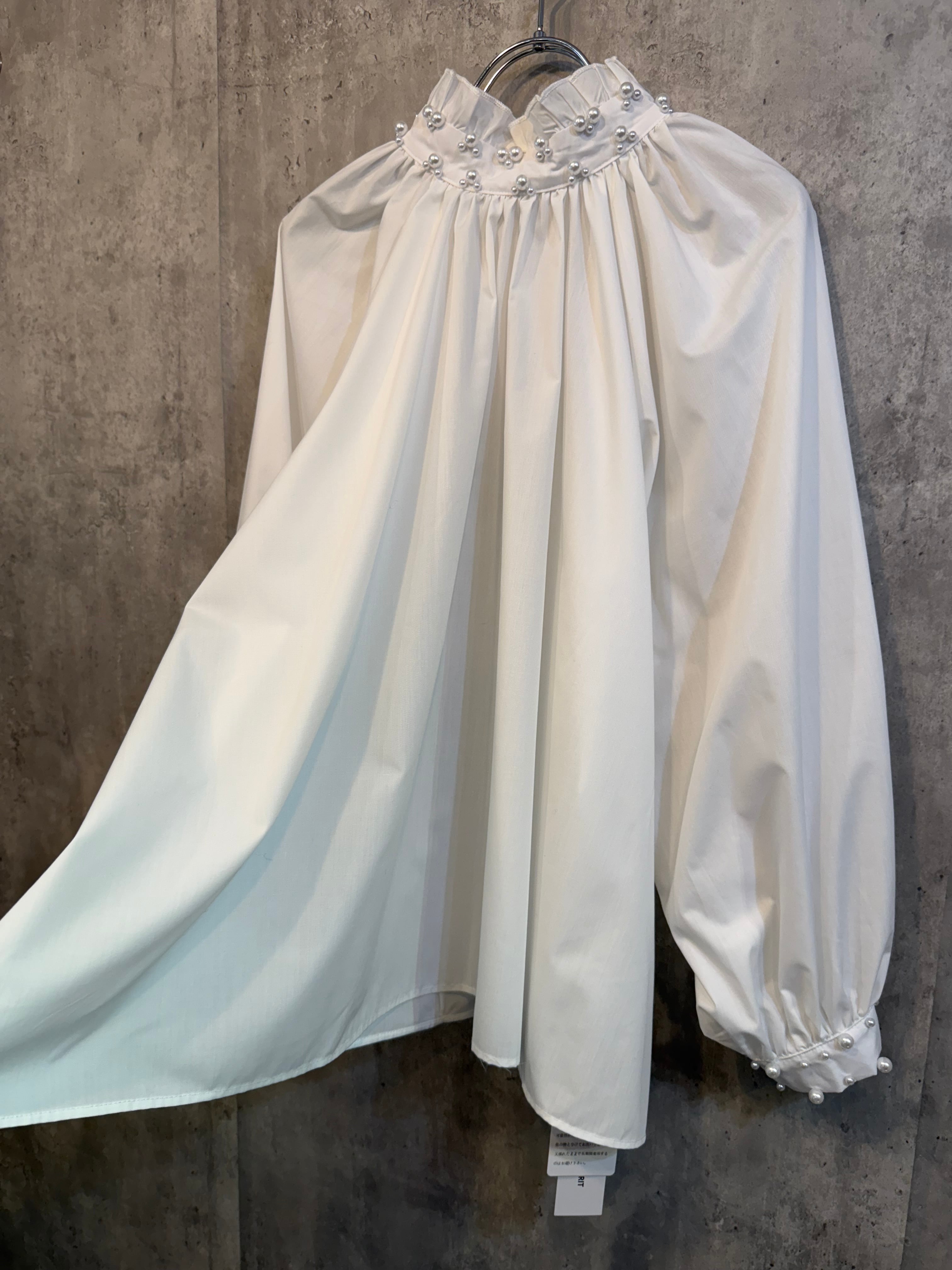 首元と袖口にあしらわれた繊細なパールが、顔まわりをぱっと明るく演出する華やぎブラウス。