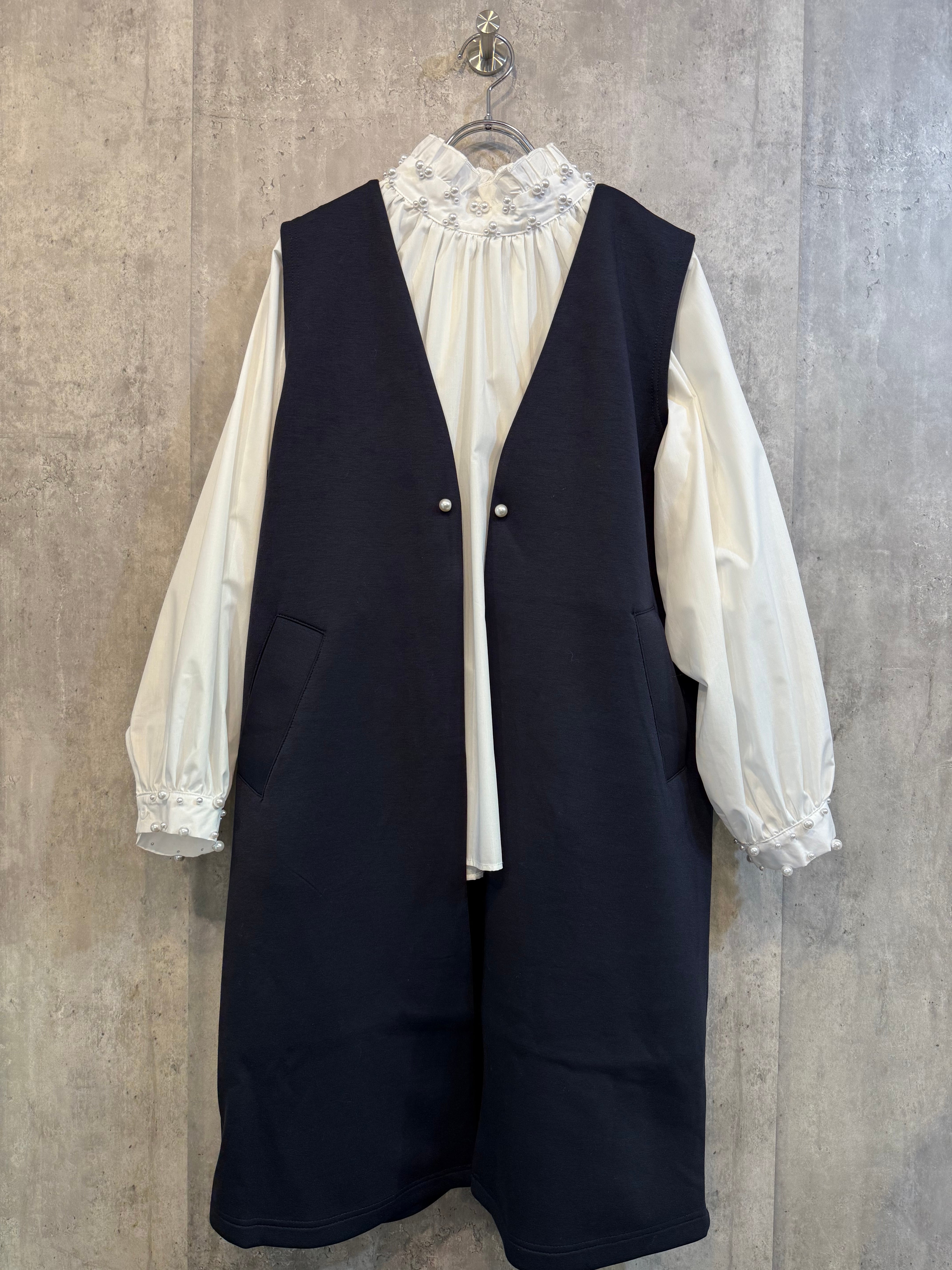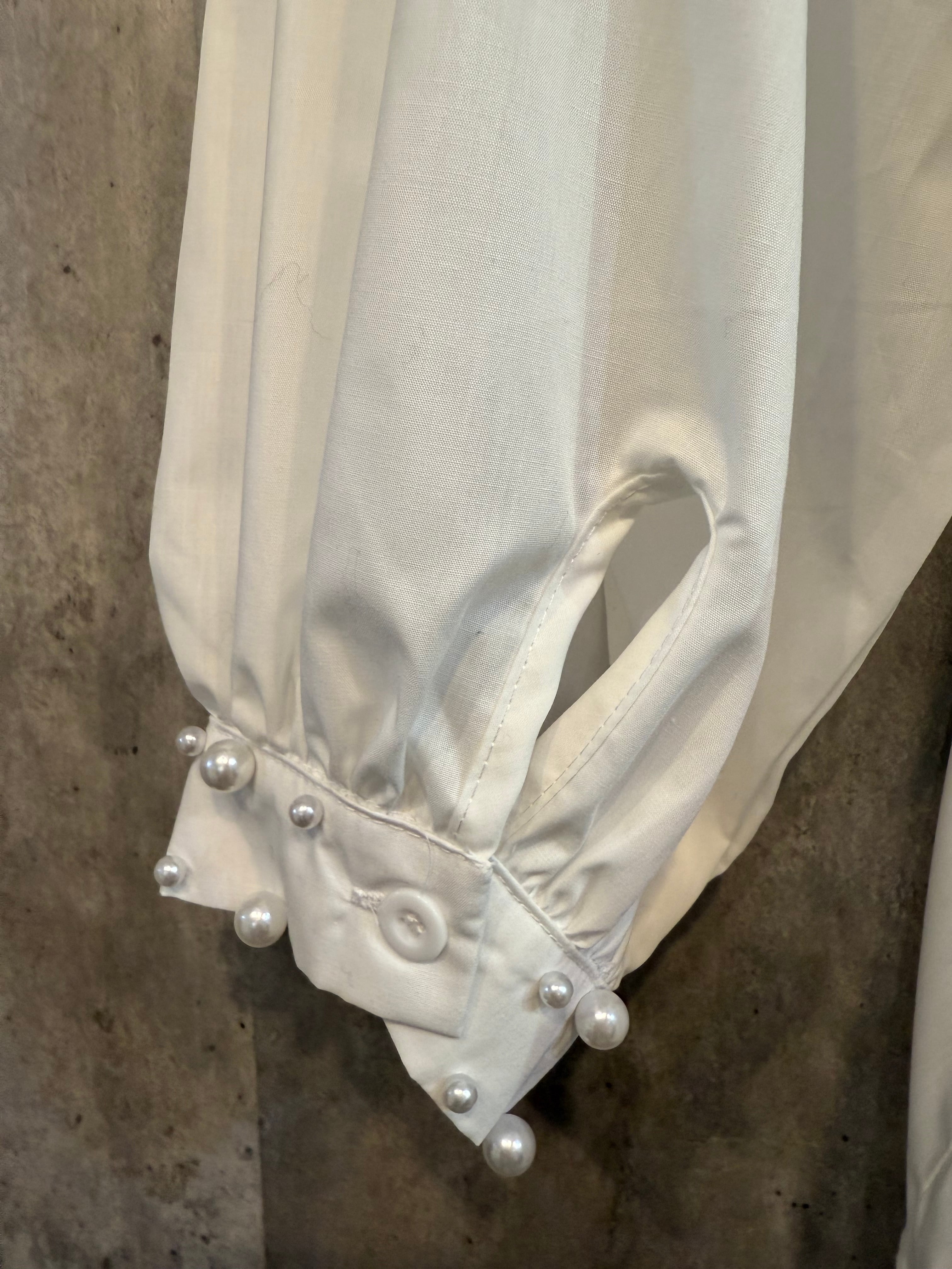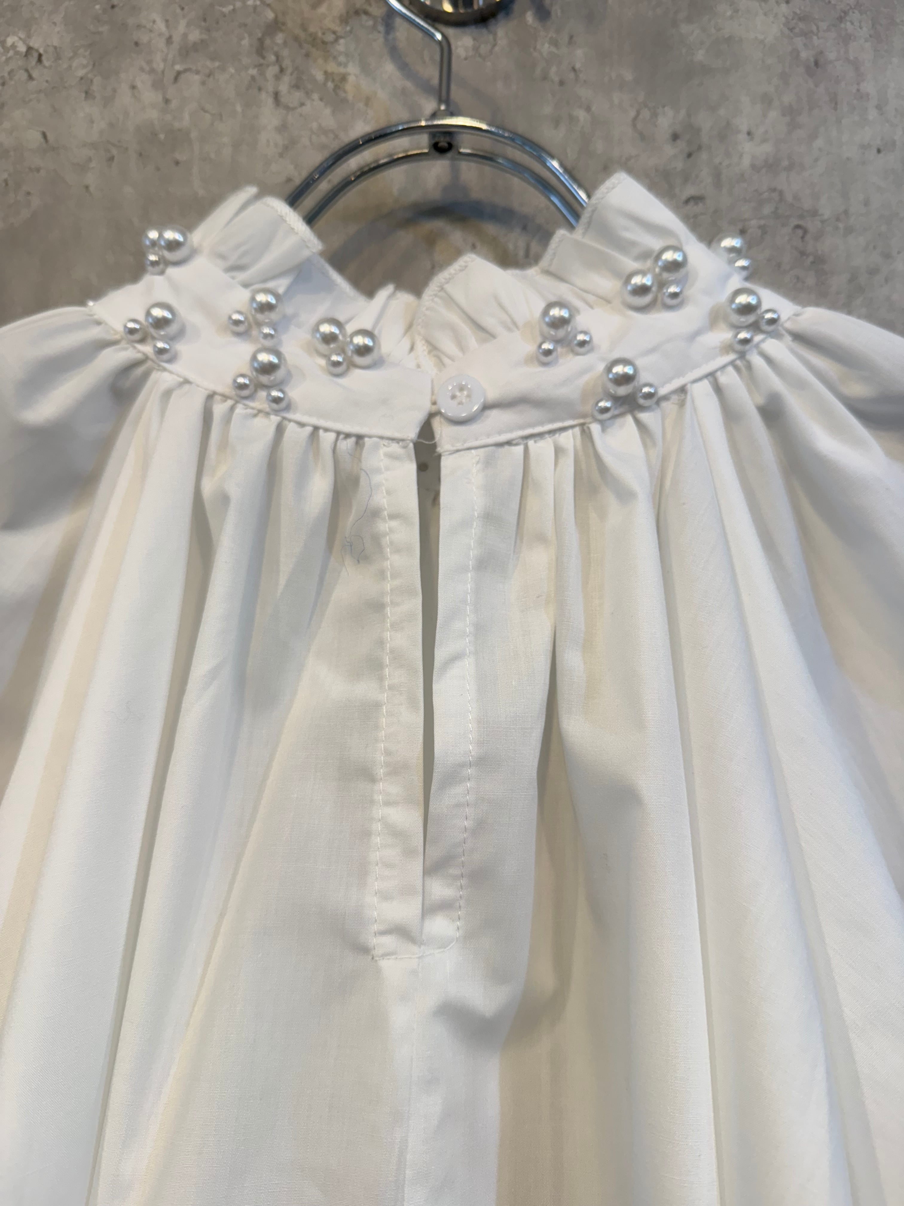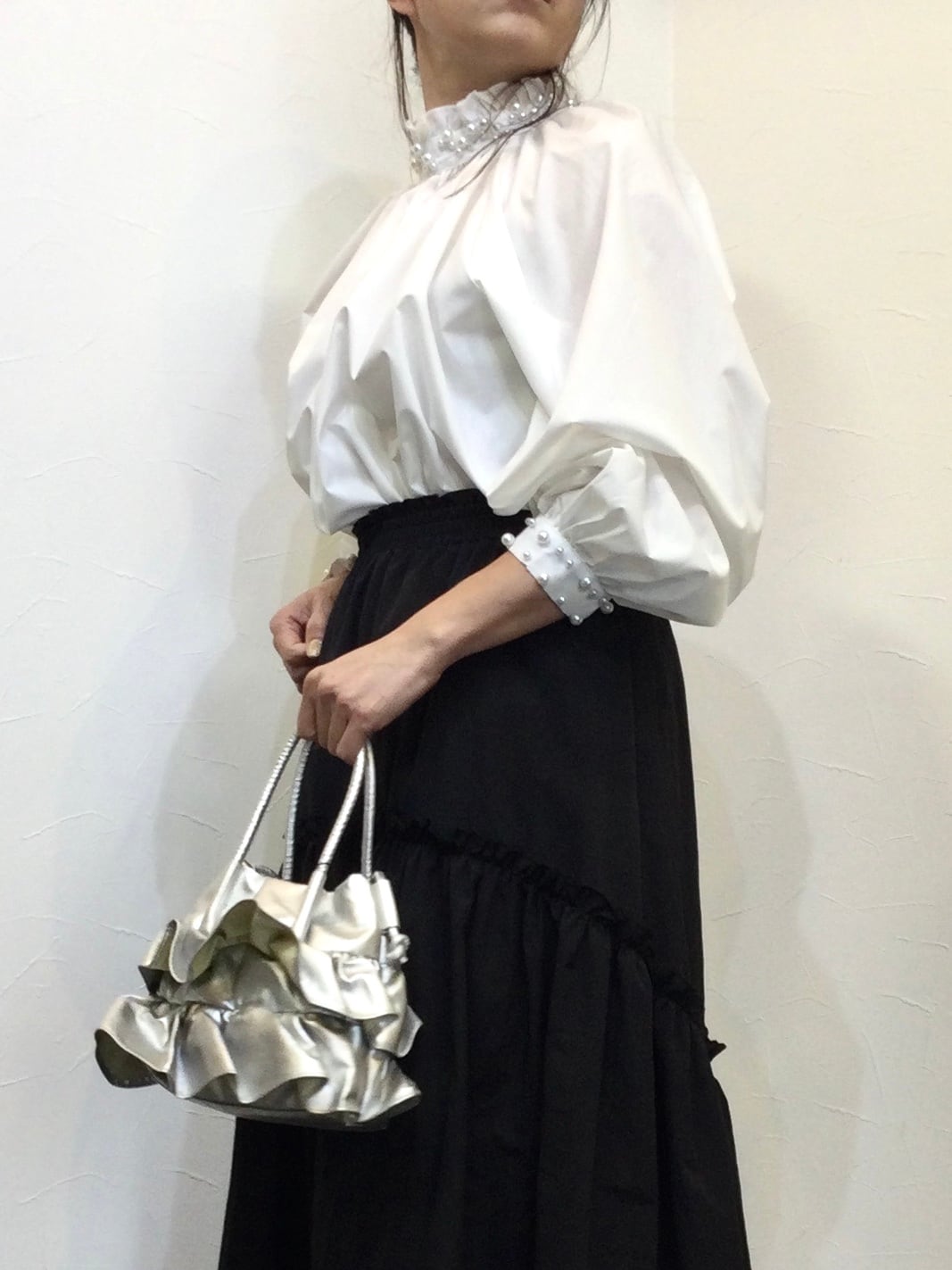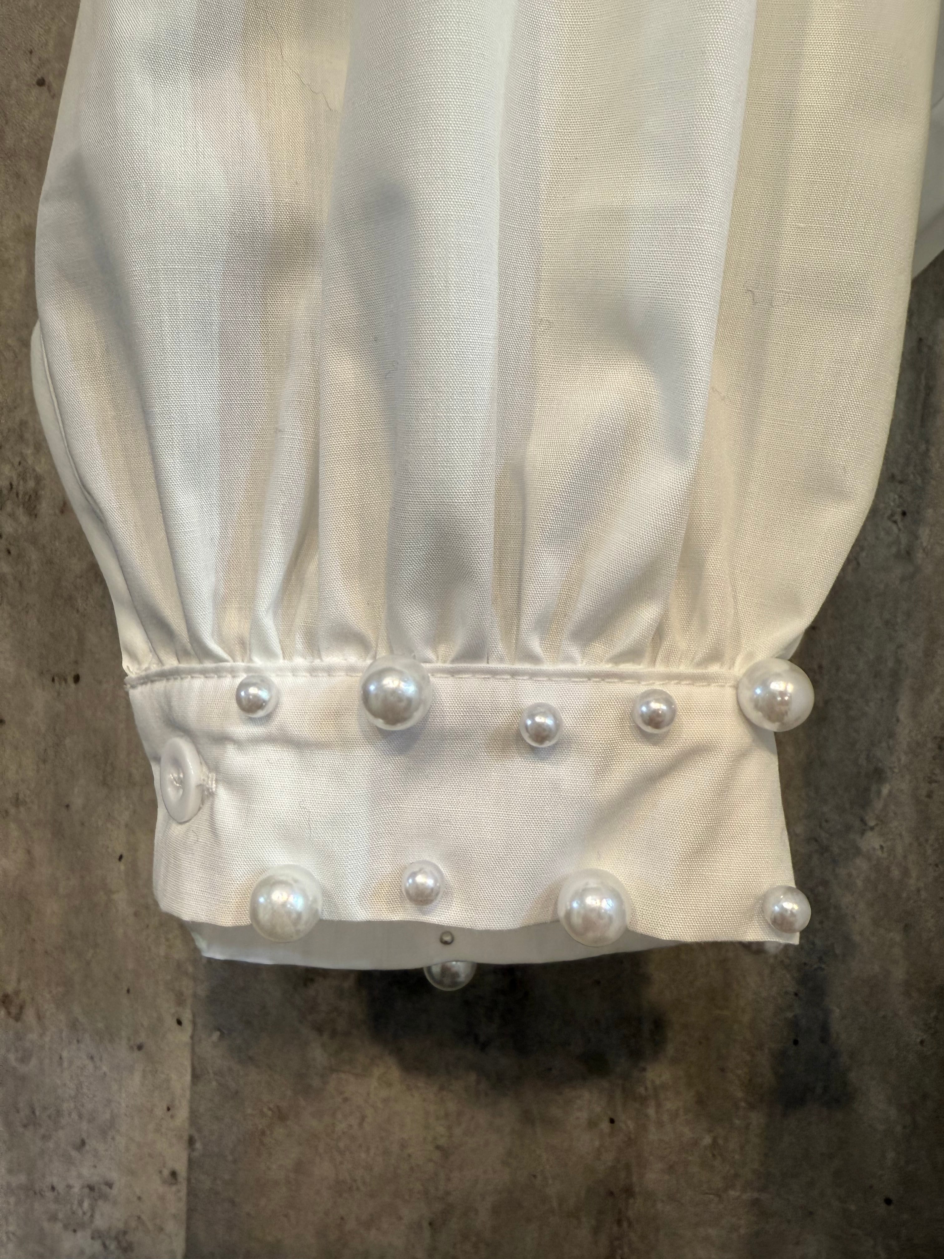 首元と袖口にあしらわれた繊細なパールが、顔まわりをぱっと明るく演出する華やぎブラウス。